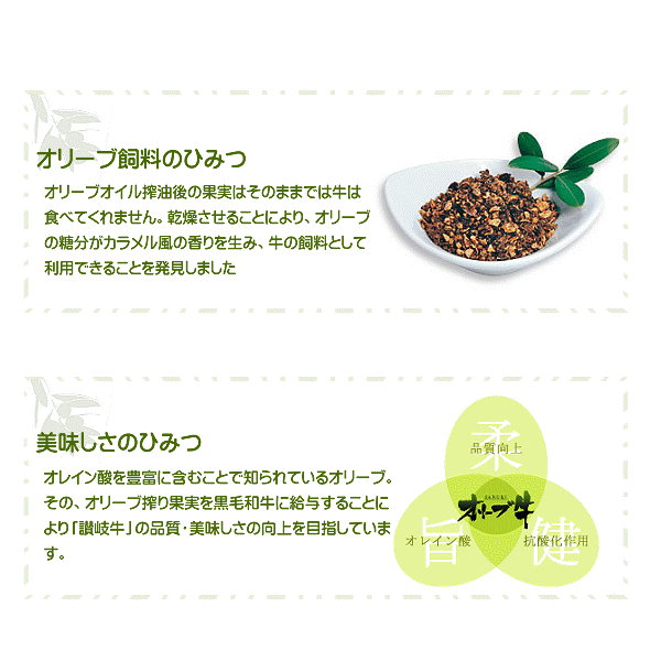 風味豊かで美味しい和牛だと自信を持っておすすめできるオリーブ牛は、香川の特産品オリーブオイルを搾油後の果実を乾燥飼料とすることで、うま味や柔らかさが向上しています。